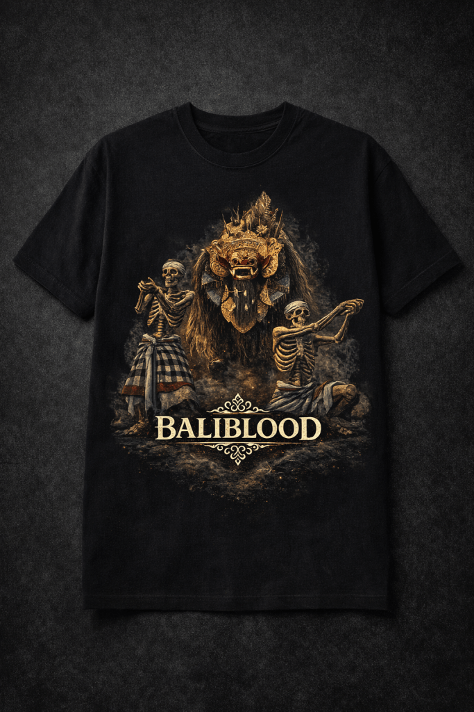 Desain ini merepresentasikan dualitas kehidupan, spirit tradisi, dan energi budaya yang tak pernah mati — modern streetwear dengan jiwa warisan Bali.