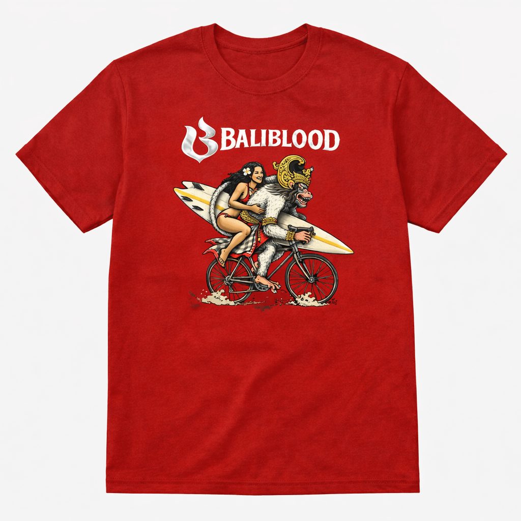 Kaos merah dengan artwork ilustratif unik yang memadukan budaya Bali dan spirit surf lifestyle. Visual karakter ikonik yang playful namun kuat menciptakan kesan fun, rebellious, dan penuh energi tropis.