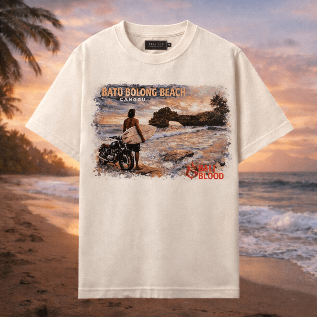 Kaos warna cream dengan artwork ilustrasi Batu Bolong Beach, Canggu. Menggambarkan suasana sunset khas Bali dengan siluet surfer dan ombak ikonik yang tenang namun penuh energi.