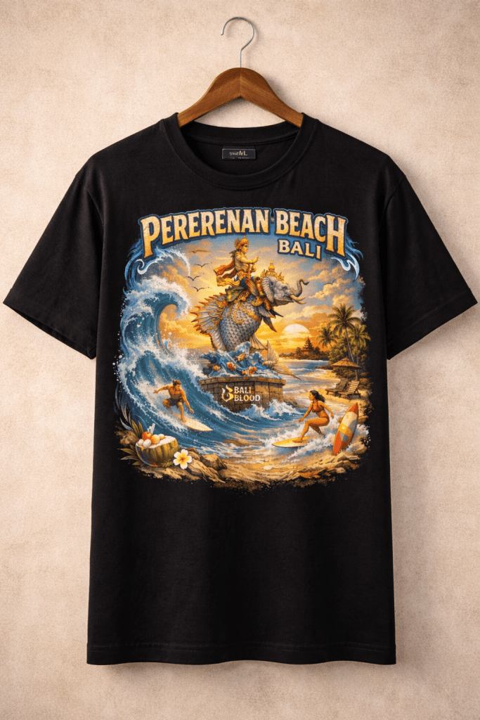 Desain ini merepresentasikan keindahan alam Bali, energi ombak, dan kekuatan tradisi yang hidup berdampingan dengan gaya hidup modern. Cocok untuk pecinta pantai, traveler, dan streetwear enthusiast yang ingin membawa vibe Bali ke mana pun mereka pergi.