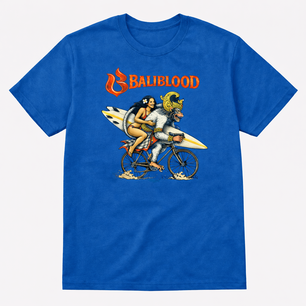 Kaos biru dengan artwork ilustratif unik yang memadukan budaya Bali dan spirit surf lifestyle. Visual karakter ikonik yang playful namun kuat menciptakan kesan fun, rebellious, dan penuh energi tropis.