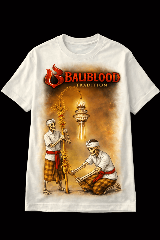 Kaos putih dengan artwork dramatis bernuansa ritual dan cahaya api sakral. Ilustrasi figur tradisi Bali yang dibalut tone emas-oranye menciptakan kesan hangat, mistis, dan penuh makna spiritual.
